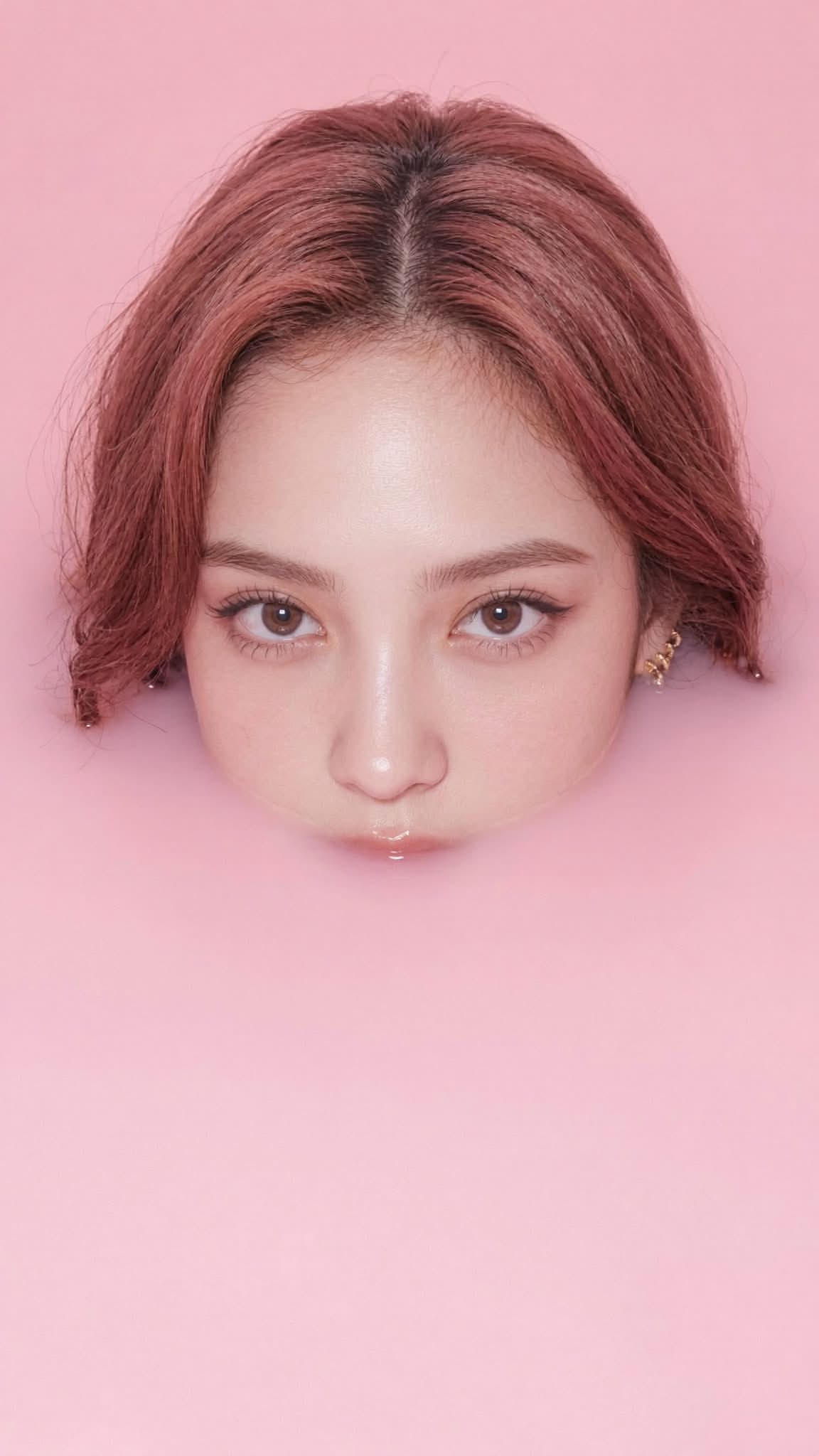 A front-facing tight close-up shot focuses on the head of a young Asian woman with pinkish auburn hair, partially submerged in opaque pastel pink liquid, with only her face and hair visible above the surface. The background matches the color of the liquid, creating a monochromatic effect with smooth transitions and soft edges. She has large, round, brown eyes accentuated by thick, dark lashes and subtle eyeliner, framed by delicately arched eyebrows. Her skin is smooth, porcelain-like, and reflective, possibly with digital retouching to yield a soft, near-porcelain finish. She wears gold hoop earrings, one visible peeking out from her hair. The lighting is soft and diffused, producing a glossy highlight on her forehead and nose, and almost no shadows. The composition is minimalistic and symmetrical, with her face centered, shot at direct eye level with a shallow depth of field, putting hair and part of the liquid gently out of focus. The dominant pink color palette and smooth textures create a stylized, dreamy, almost surreal, and hyperreal mood, reminiscent of contemporary editorial or beauty campaign photography.