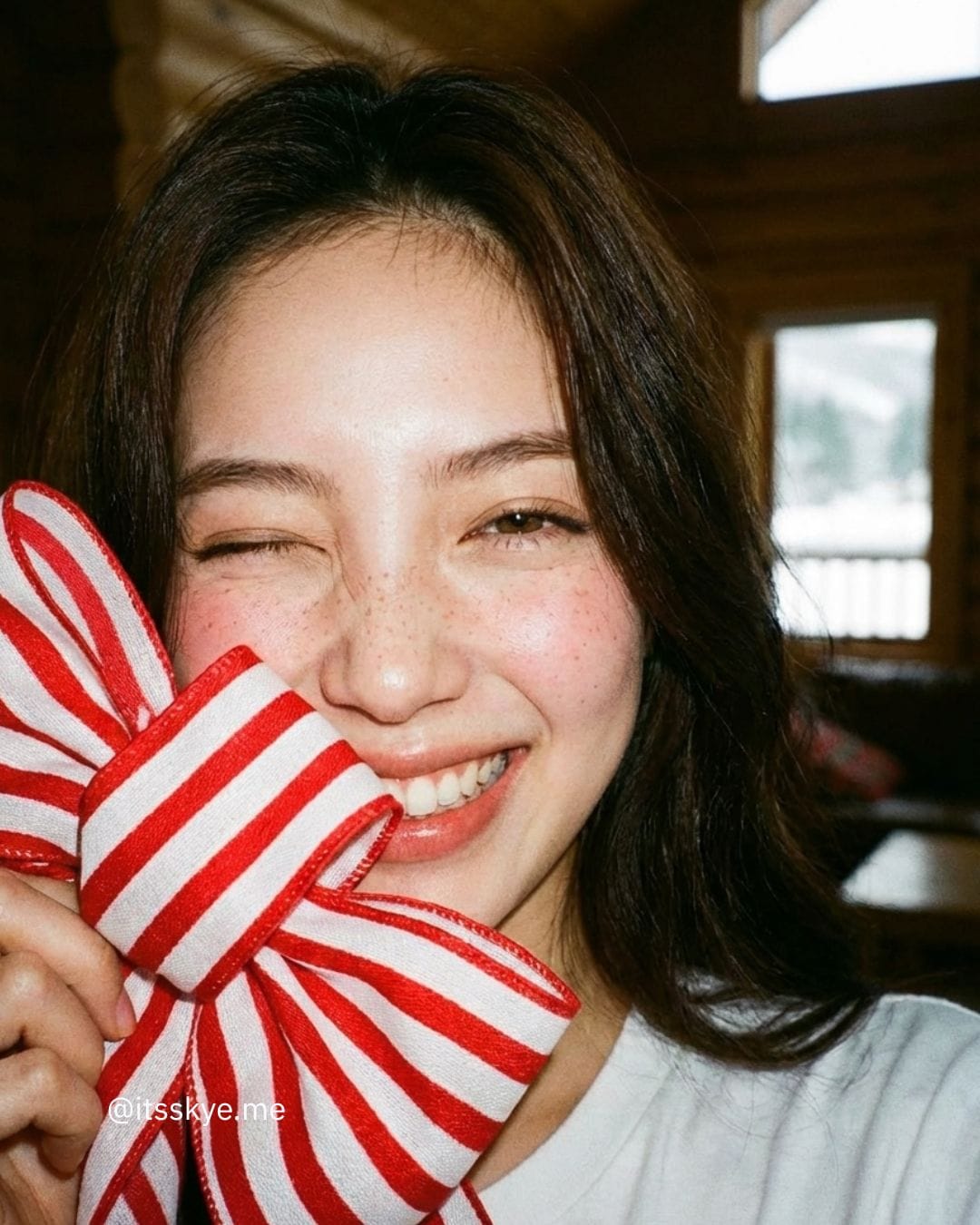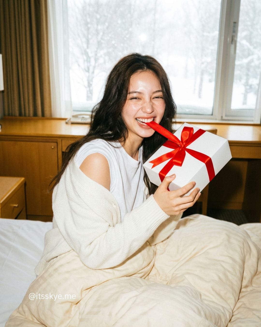 json { "action": "Kneeling on a plush white bed, one hand softly touching her cheek, looking into the lens with a calm, sultry gaze. A large red and white striped ribbon is draped over her shoulder.", "expression": "Sultry, calm, elegant eye contact", "style": "90s vintage 35mm film, direct camera flash, high contrast, warm skin tones, sharp shadows", "background": "Luxury Hokkaido hotel room, dark wood-paneled walls, large window showing heavy snow falling outside at night, a small red designer lamp on a side table", "color_palette": "Deep walnut wood, candy-cane red, snowy white, warm amber" }