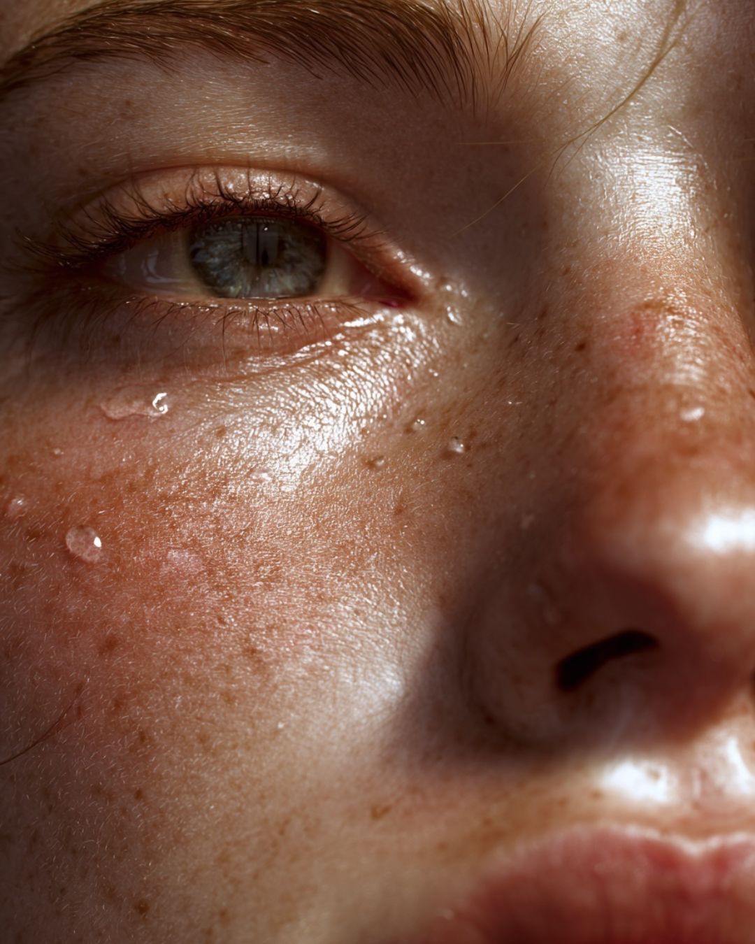 Close-up of a young woman's face, eyes wide open and wet with tears. Clearly visible skin texture, with details showing redness from intense emotion. Realistic photographic style. Soft, dramatic lighting, professional photography, professional color grading, high resolution.