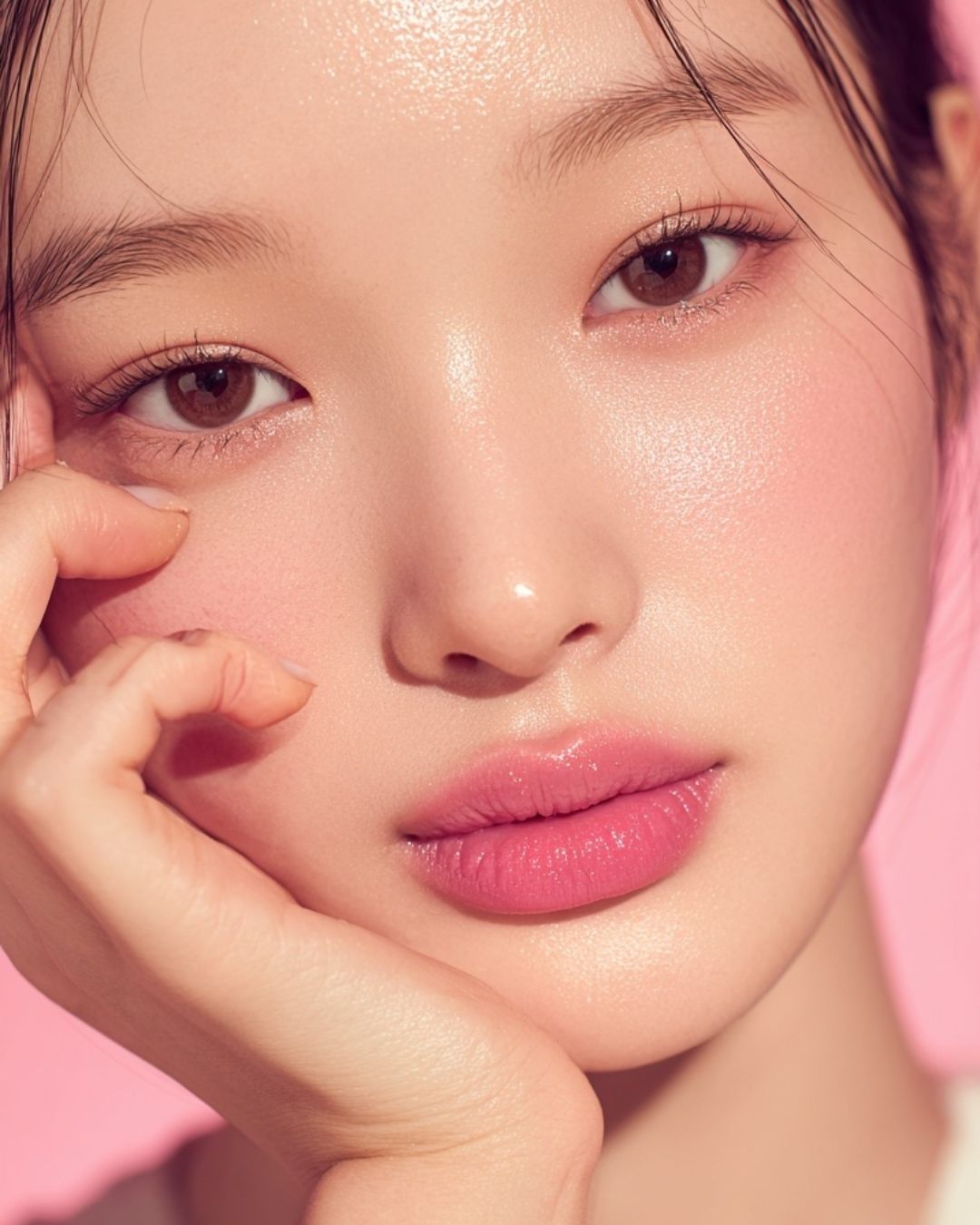 Hyper-realistic close-up portrait of a beautiful Asian woman, glowing dewy skin, natural luminous texture, calm dreamy expression, one hand gently framing her face. Soft ambient pink lighting, centered composition, highlight eyes, lips, and cheekbones. Softly lit baby pink background, high-end Korean skincare ad style.
