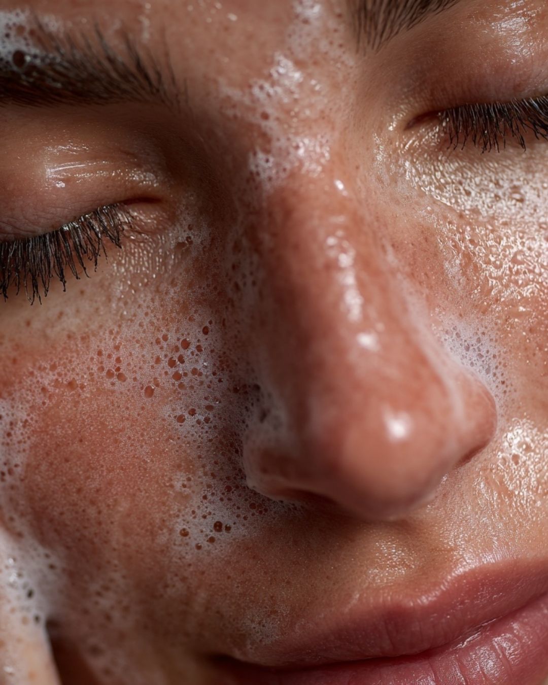 Highly realistic shot of a young woman washing her face with abundant foam, hands applying foam to her skin. Skin appears glossy, smooth, and ultra-realistic. Photorealistic beauty skincare photography, soft lighting, high detail.