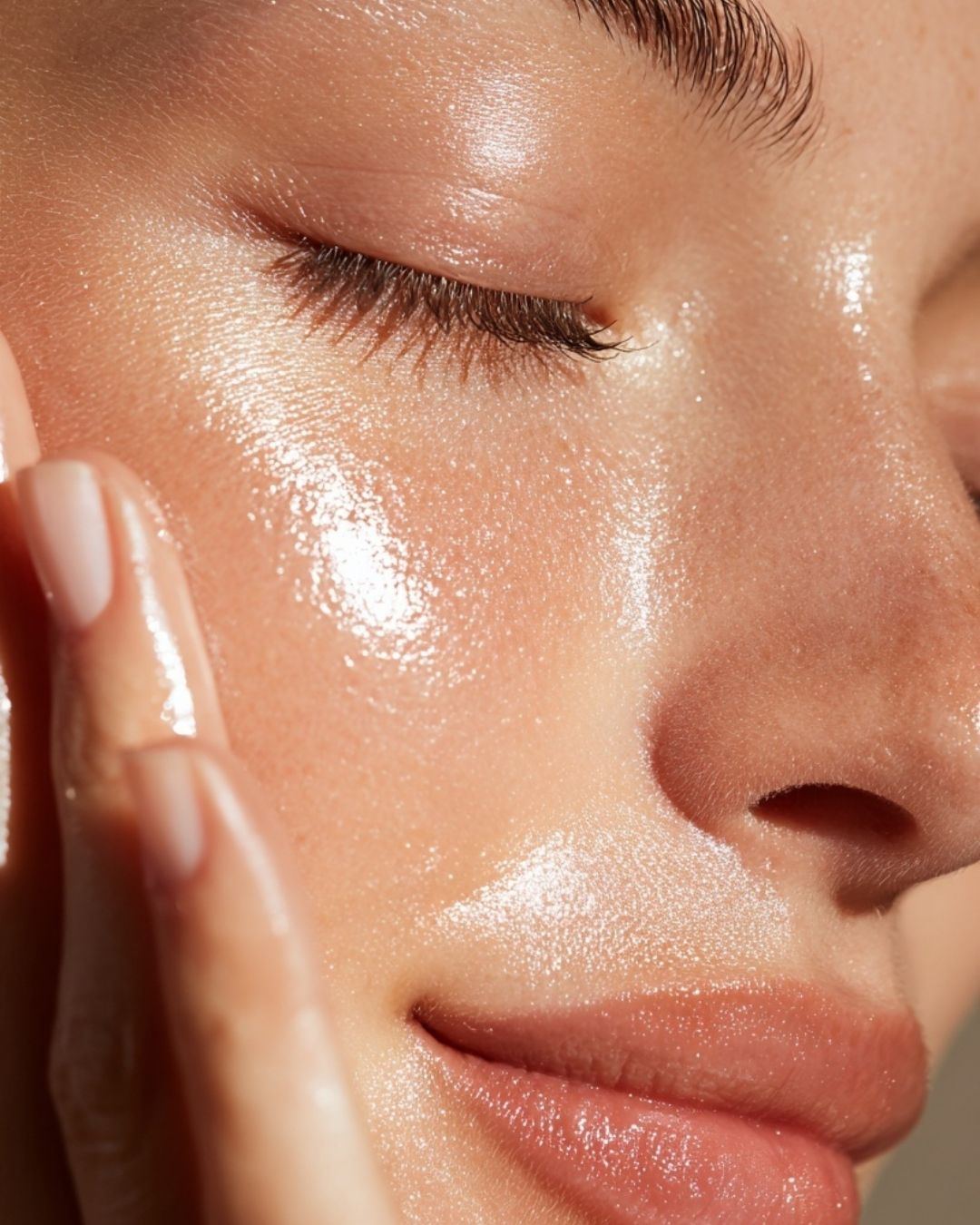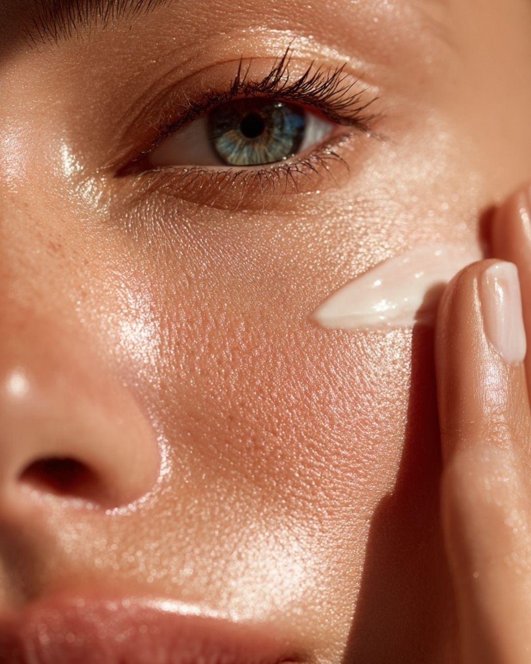Highly detailed close-up photograph of real human skin, visible natural texture, pores, and light reflections. Healthy hydrated skin, realistic imperfections, natural glow. Soft warm lighting , emphasizing organic texture and tonal variations. Minimalist composition, no text, ultra-realistic beauty photography, editorial skincare aesthetic, 8k close-up.