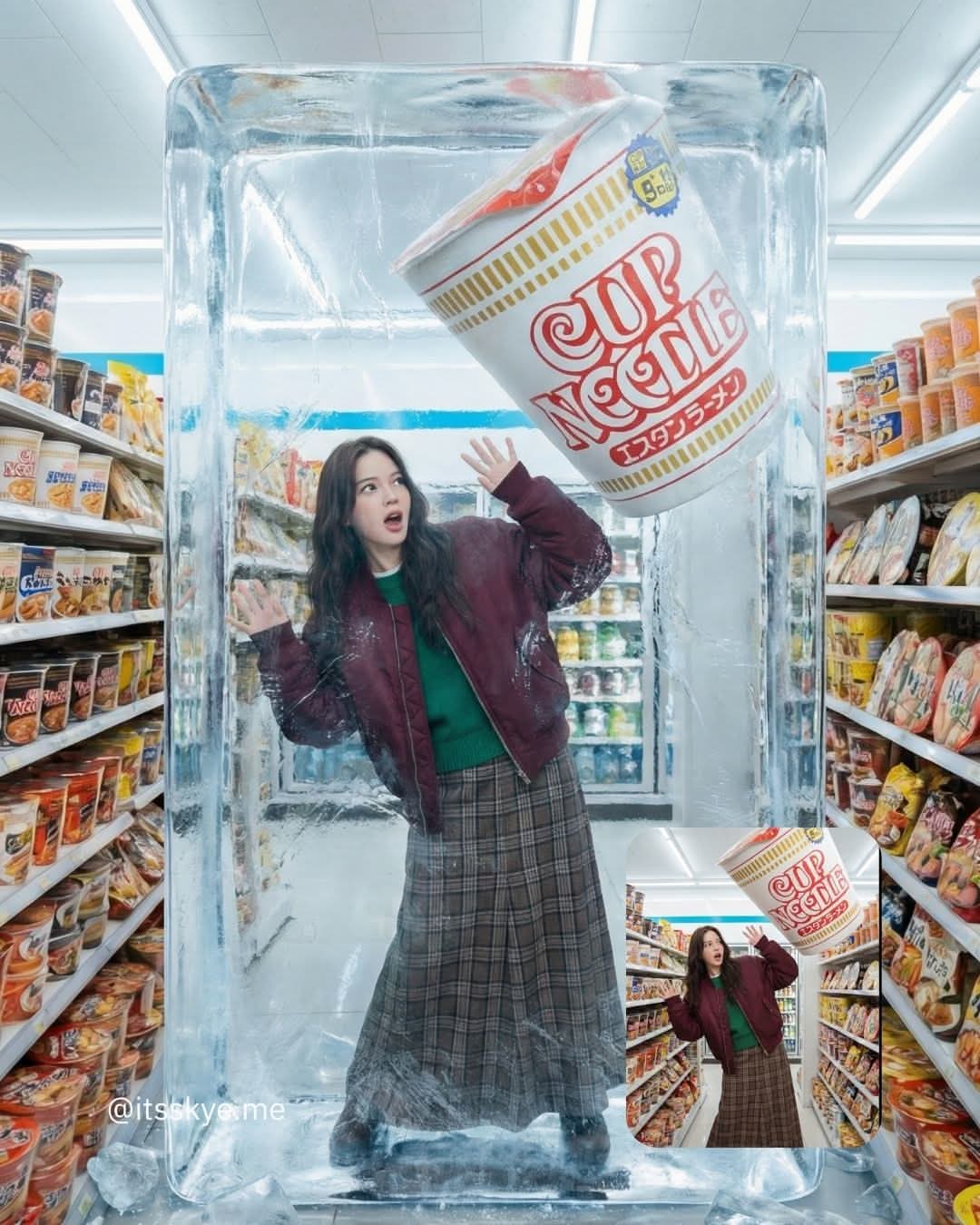 Original image subject/pose/clothing/background/composition/camera angle, unchanged. Subject fully encased inside a large rectangular block of ice. Ice block: crystal clear, heavily frosted inner surfaces, trapped cold air swirls, frozen cracks, natural imperfections, volumetric density, subject deep inside. Thick, smooth, slightly rounded, semi-transparent ice edges. Realistic scattered ice shards/broken chunks surrounding the base, ice block integrated with ground. Realistic refractions, light bending, shadows, and reflections from the ice. Subject completely enclosed, nothing sticking out. Hard rules: NO melting water. DO NOT change subject details/colors/pose. DO NOT change composition/cropping. Ultra-realistic ice texture, high-detail texture, crisp clarity, subtle cold glow inside ice, depth-accurate occlusion. Cinematic street-fashion photo realism, photorealistic