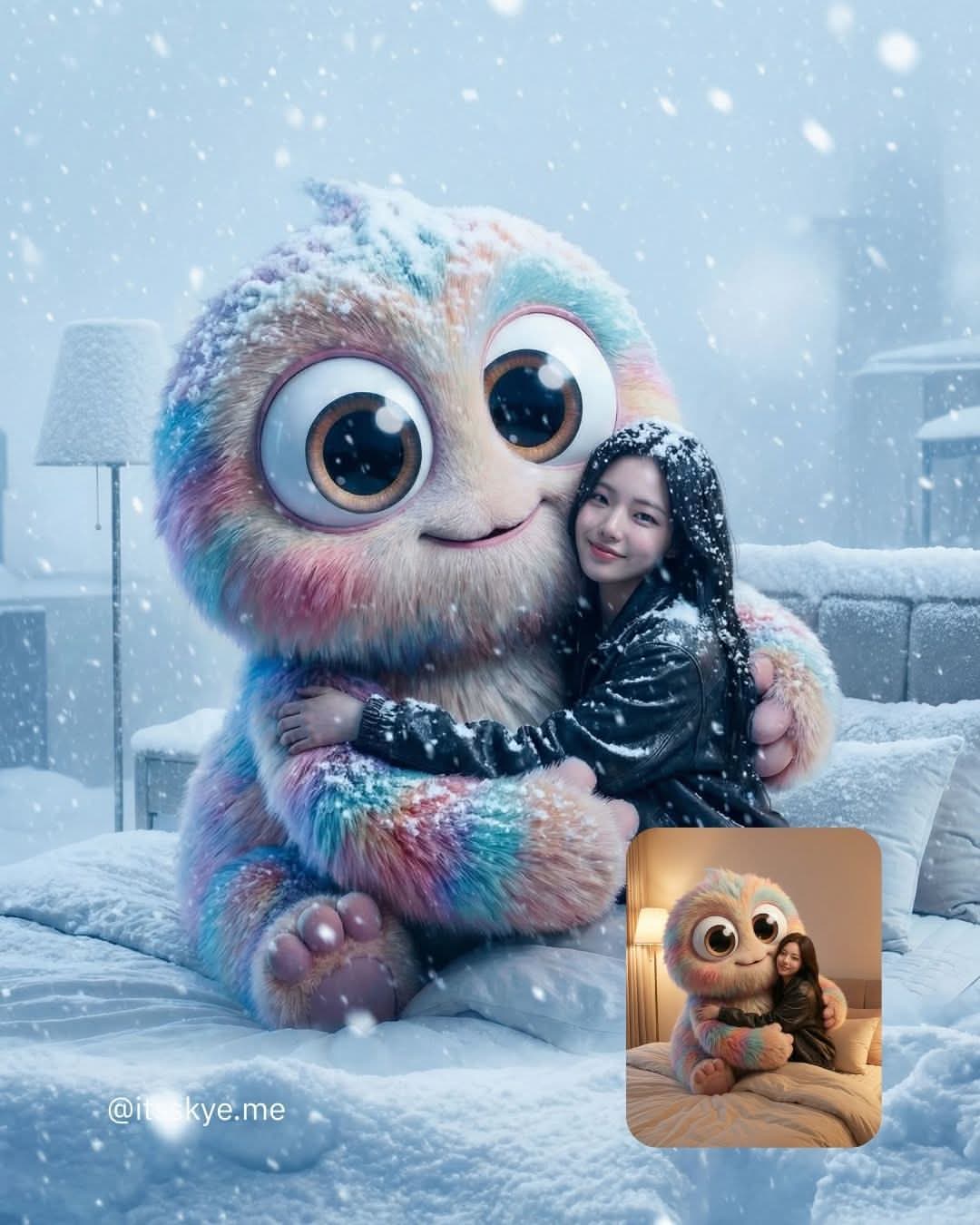 Original image subject/pose/clothing/background/composition/camera angle, unchanged. Deep winter, heavy blizzard, extreme snowfall, dense snow flakes multiple depths, heavy ground snow cover, thick snow piles, realistic snow accumulation on all surfaces (rooftops, railings, ledges, shoulders, hair edges). Cold winter color grading, cool tones, crisp whites, deep blue shadows, foggy cold air haze in distant background. Fresh, compacted, high-quality snow texture. Ultra-realistic ice texture, subtle cold glow inside ice block, depth-accurate occlusion. Hard rules: NO warm glow, NO fairy lights, NO Christmas lighting/decorations. DO NOT change clothing. DO NOT change composition/cropping. NO added props. Cinematic street-fashion photo realism, high detail, crisp clarity, photorealistic.