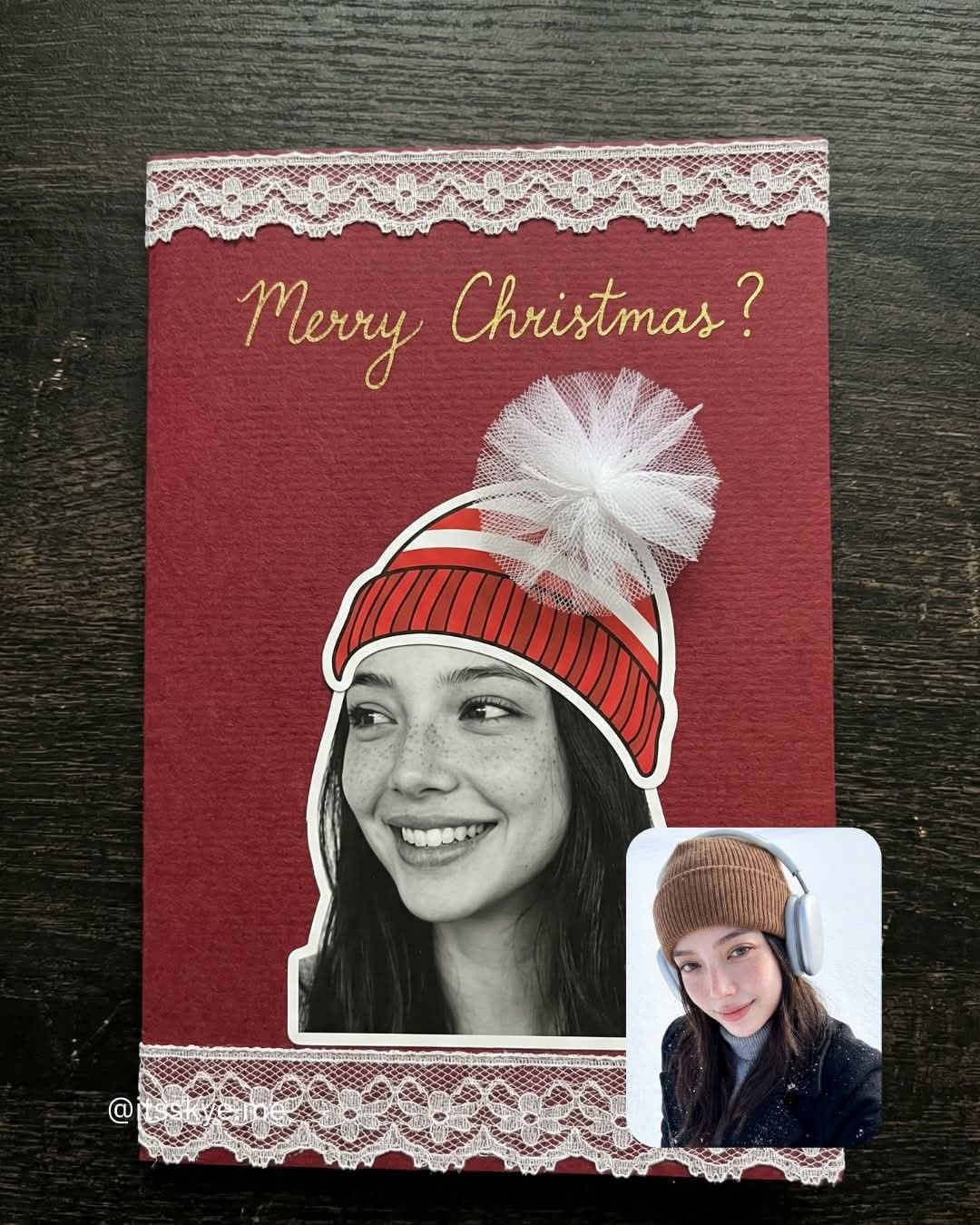 The image shows a handmade Christmas card. The cover is dark red and decorated with lace trim along the top and bottom edges, giving it a delicate, whimsical feel. At the center of the cover is a black-and-white cutout smiling and looking to the side face of this person. It has sticker of Christmas beanie on head.On top of the hat sits a fluffy white tulle pom-pom. Handwritten text decorates the cover: Merry Christmas?" The book rests on a dark textured surface.