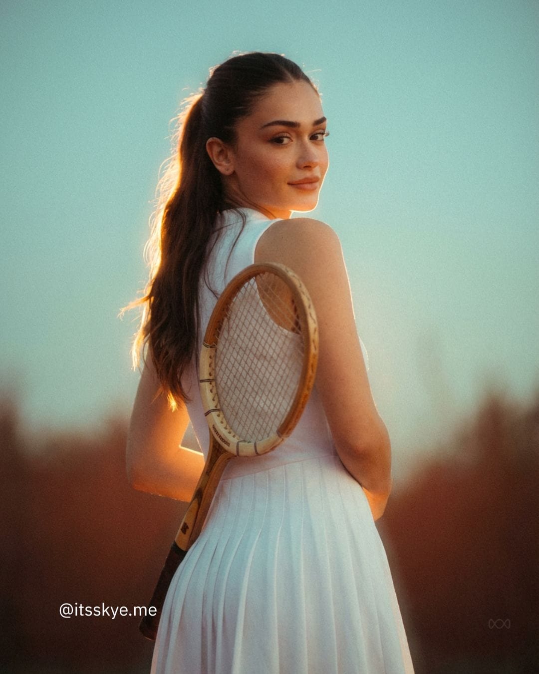 Back view of a woman in a white tennis dress, looking back over her shoulder at the camera. She is holding a tennis racket behind her back. Sun creates a glowing rim light on her hair. Soft teal sky background.