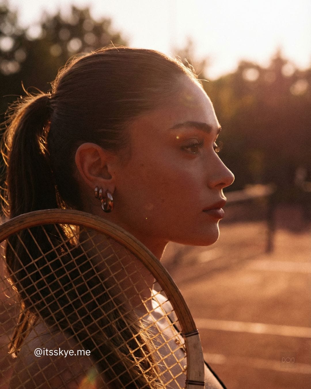 Style: 1990s vintage photography aesthetic, analog film look, dreamy soft focus, heavy film grain, ethereal atmosphere, cinematic lighting, golden hour, sunset, warm reddish-brown haze, retro fashion, vintage tennis racket --ar 4:5 --style raw