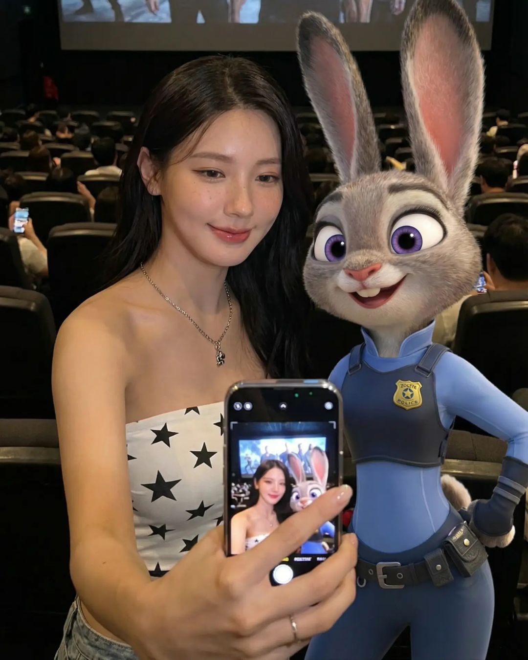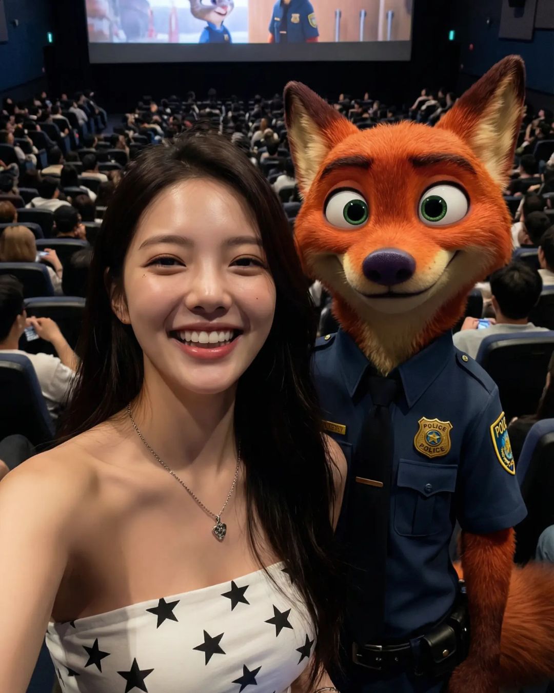 The uploaded photo’s person and "Judy Hopps" or "Nick Wilde " (Zootopia), standing side-by-side, taking a selfie. The girl is smiling, black long hair, wearing a white strapless top with black stars, silver necklace. Judy Hopps is smiling, wearing a police uniform. Crowded cinema hall interior, large movie screen displaying a Zootopia scene in the background, slightly dim. Cinematic lighting, dramatic shadows, photorealistic, ultra-detailed, 8K, high quality.
